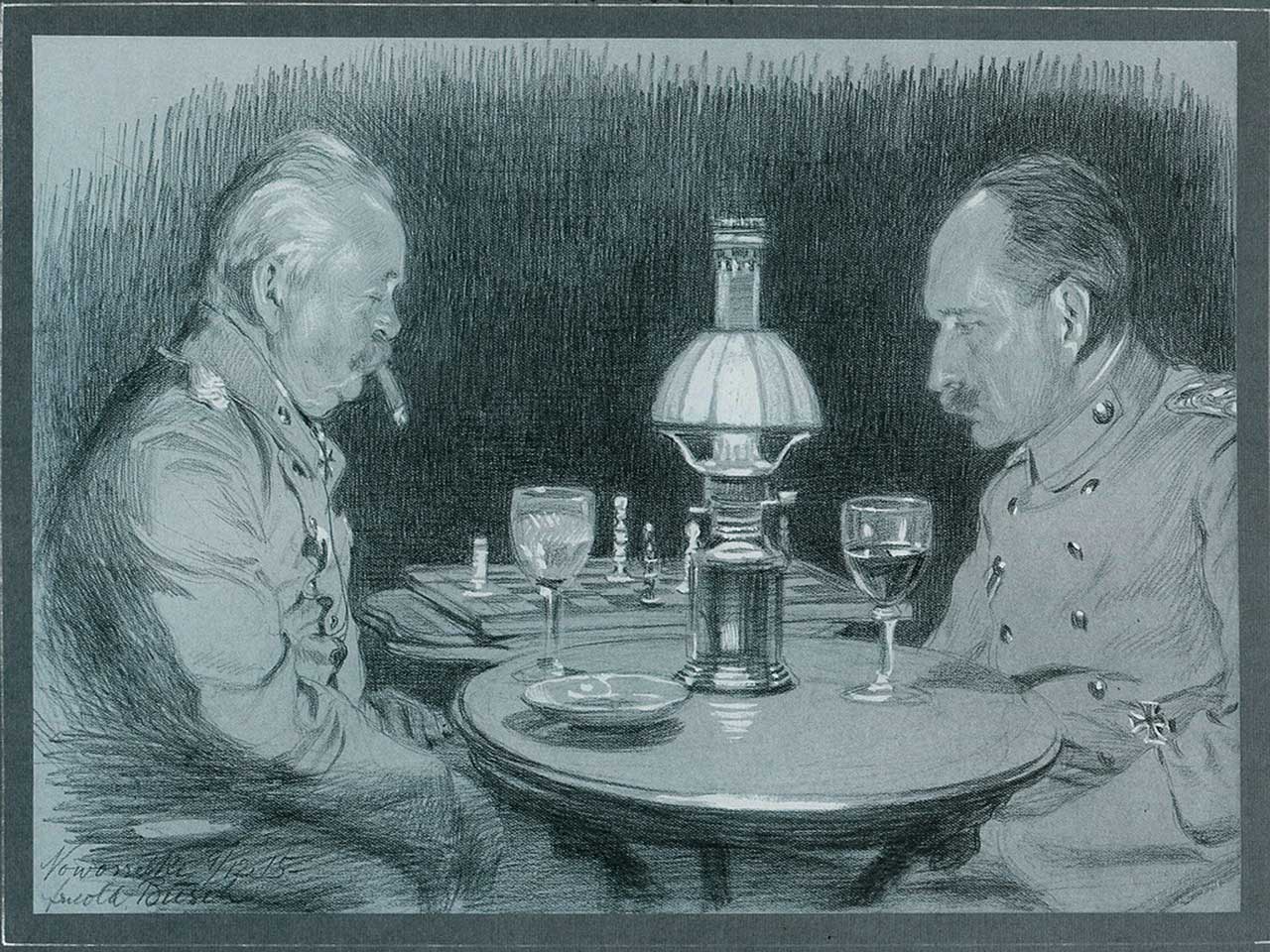 Восенню 1915 года лінія руска-нямецкага фронту спынілася на тэрыторыі суседняй Смаргоншчыны, у маёнтку Навасёлкі размяшчаецца штаб 40 рэзервовага корпуса. У Берлінскай дзяржаўнай бібліятэцы захоўваецца малюнак з подпісам «Партрэт генерала Карла Літцмана з яго ад’ютантам Менгельбірам», дзе за шахматнаю дошкаю адлюстраваны ўзгаданыя персанажы. У левым ніжнім куце малюнка вядомы нямецкі мастак і графік, аўтар партрэтаў генералітэта нямецкай арміі Арнольд Буш пазначыў, што малюнак быў выкананы ў Навасёлках 5 снежня 1915 года. Так стаў вядомы выгляд асобы пошуку.