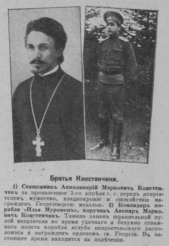 Распавядаючы пра вядомага ваеннага лётчыка і афіцэра Авяніра Кансценчыка, нельга не закрануць некаторыя старонкі біяграфіі яго старэйшага брата Апалінара Маркавіча Кансценчыка(1888-1973). Падзеі Першай сусветнай вайны таксама адбіліся на яго лёсе, як і на лёсе брата Авяніра. Пасля пасвячэння ў 1916 годзе ён служыць вайсковым святаром на фронце. Спачатку выконваў пастырскія абавязкі ў Другім баявым атрадзе эскадры паветраных караблёў “Ілья Мурамец”, потым быў святаром 119-га заходняга шпіталя, 44-га Белгарадскага палка. За праяўленую 3(16) красавіка 1916 года “перад ворагам мужнасць, вытрымку і спакой” Апалінар Кансценчык быў узнагароджаны Георгіеўскім медалём. Гэтую ўзнагароду ў выглядзе нашыўкі на святарскім адзенні можна заўважыць на адным з фотаздымкаў.