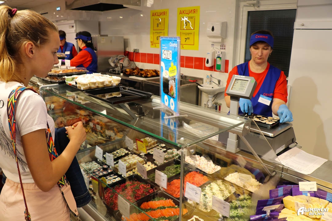 В просторном торговом зале магазина достаточно широкий ассортимент товара: собственная выпечка, многообразие полуфабрикатов, широкий выбор колбас и колбасных изделий, сыров. В ассортименте продовольственные и непродовольственные товары, хлебобулочные изделия, многообразие овощей, фруктов, сладостей.