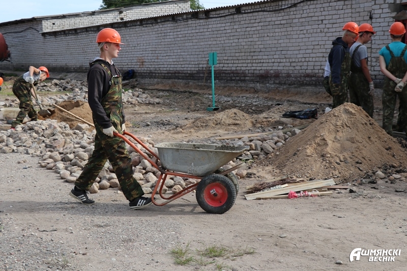 На пад’ездзе да майстэрняў аграрна-эканамічнага каледжа ўжо здалёк бачна, як юныя студатрадаўцы старанна і рупліва працуюць. Сёння пад кіраўніцтвам Івана Ляшчэвіча на будоўлі — дзесяць навучэнцаў 3-га курса.