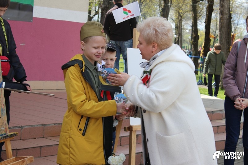 В день Победы ошмянцев ждала интересная и насыщенная программа. После торжественной части праздника «Нам 41-й не забыть, нам 45-й вечно славить» жителям района и гостям были предложены концерты. Параллельно проходил пленэр «Малюем гісторыю разам”, в котором приняли участие юные художники Ошмянской и Гольшанской детских школ искусств. Перед тем, как ребята отправились на сбор этюдного материала, директор Ошмянской школы искусств, председатель первичной организации отдела идеологической работы, культуры и по делам молодежи РОО “Белая Русь” Жанна Можейко поздравила их с праздникам и вручила сувениры от общественного объединения.