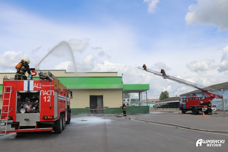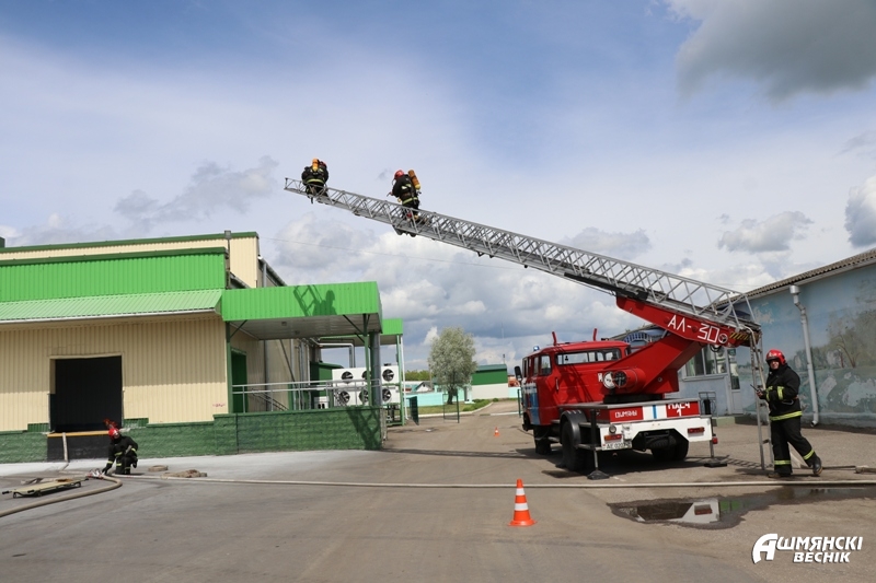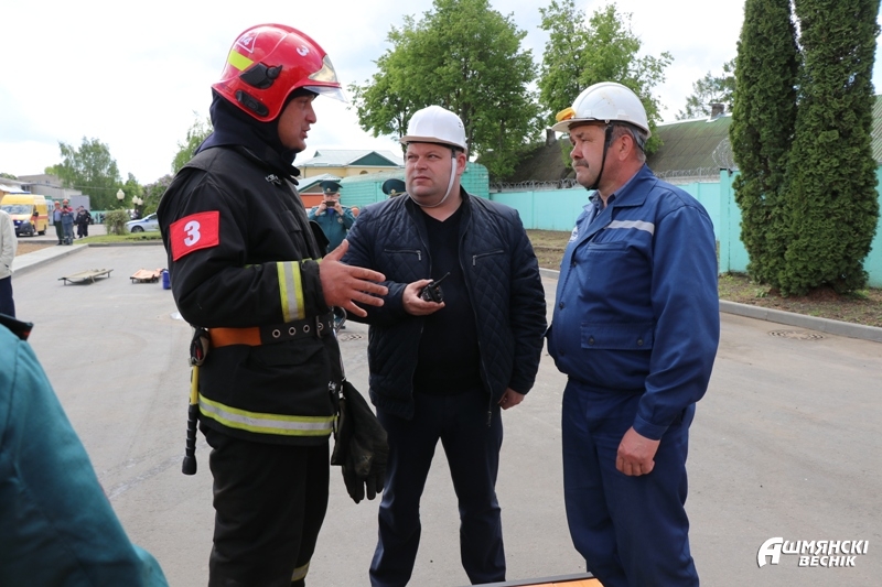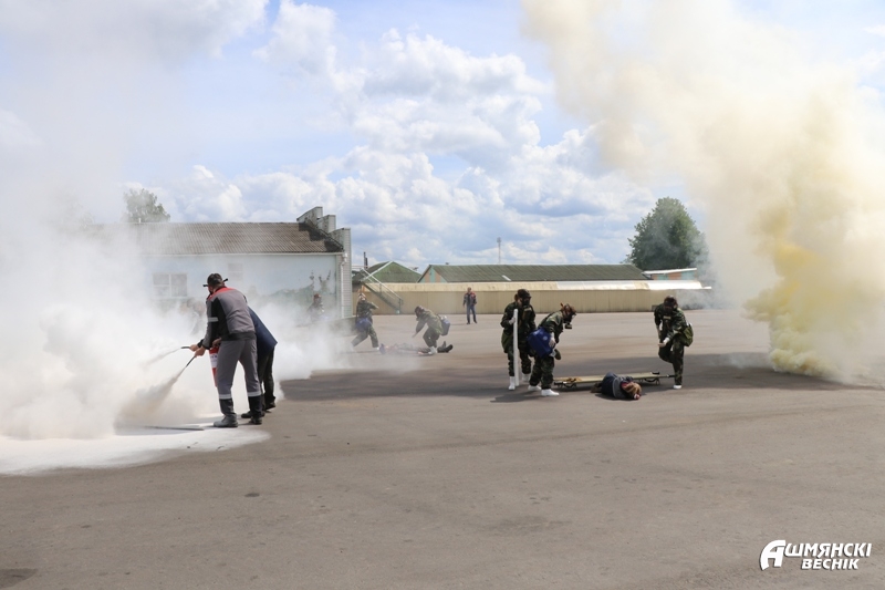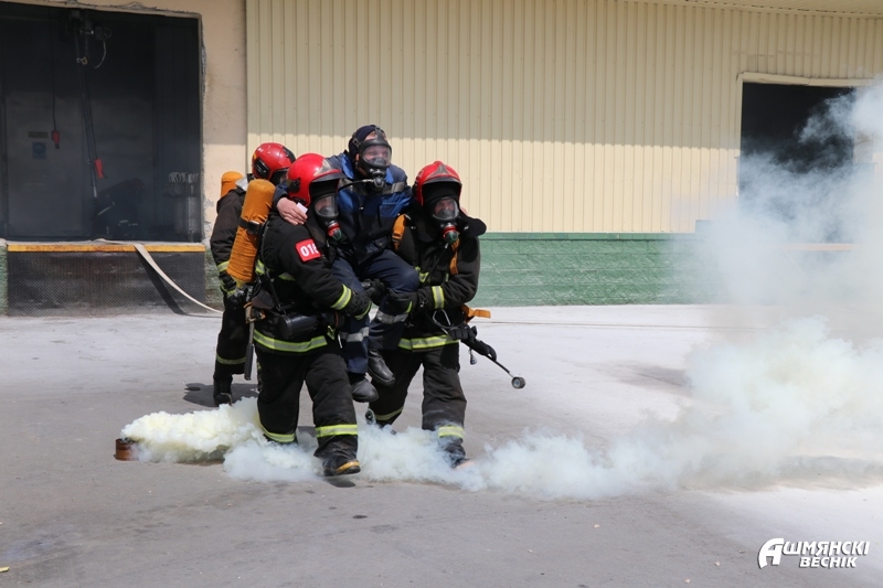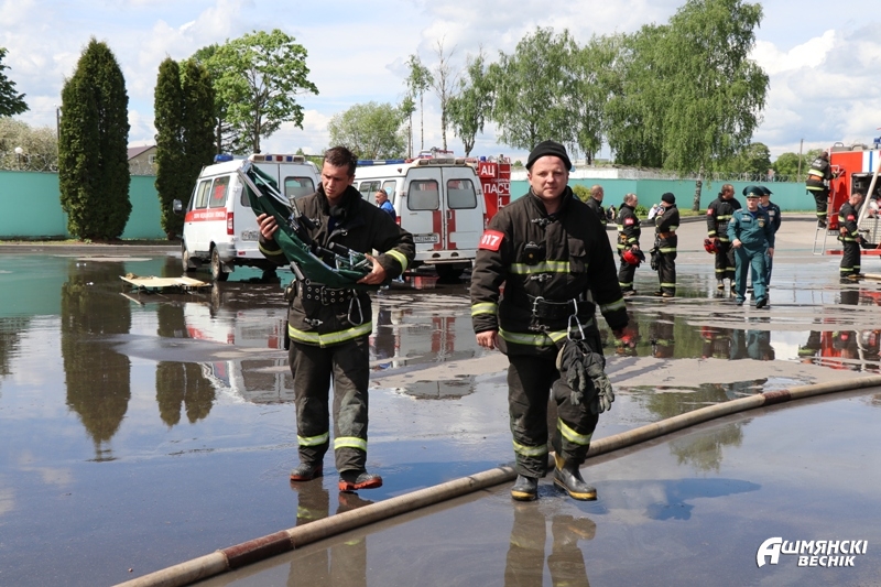 Финальная вводная учений была самой трудной и – зрелищной. По легенде на территории ОАО «Ошмянский мясокомбинат» в результате работы диверсионно-разведывательной группы противника произошел подрыв склада хранения готовой продукции. Без вести пропавшими числятся девять человек. В работу первыми включаются добровольная пожарная и санитарная дружины предприятия.