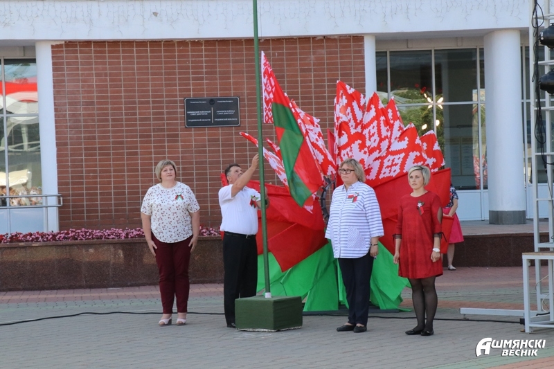 Свята прадоўжылася выступленнем групы сцяганосцаў з ліку навучэнцаў аграрна-эканамічнага каледжа, да якіх далучыліся прадстаўнікі калектываў раённага аддзела па надзвычайных сітуацыях, раённага аддзела ўнутраных спраў, ваеннага камісарыята раёна. Урачыстае права падняць Дзяржаўны сцяг Рэспублікі Беларусь атрымалі лепшыя працаўнікі розных сфер народнай гаспадаркі, занесеныя па выніках мінулага года на раённую Дошку гонару: Іна Гайдукевіч – настаўнік па класу баяна Гальшанскай дзіцячай школы мастацтваў, Святлана Качан – прараб участка апрацоўчых работ ААТ “Будаўнік”, Сяргей Лапшоў — галоўны ветэрынарны ўрач раёна, начальнік раённай ветэрынарнай станцыі, Святлана Фурса – машыніст расфасовачна-упаковачных машын УП “Ашмянскі дражджавы завод”.