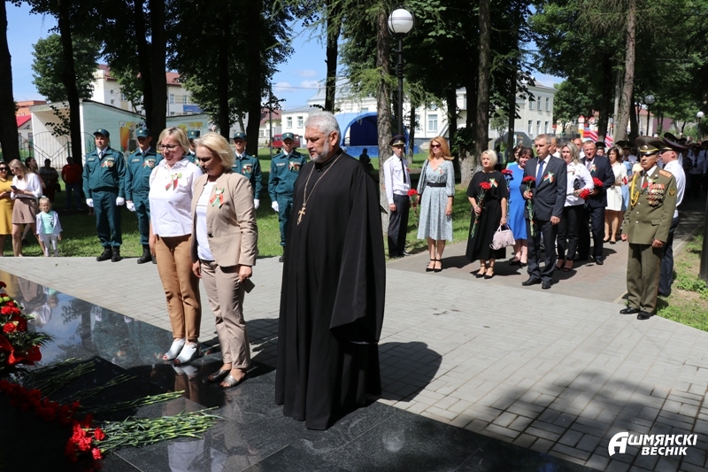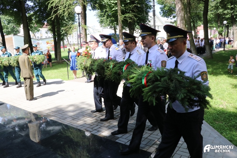 У знак павагі да нашага гераічнага мінулага і тых, хто адваяваў мірнае неба над нашай сінявокай краінай, кіраніцтва раёна, прадстаўнікі працоўных калектываў, грамадскіх аб’яднанняў, жыхары раёна ўсклалі кветкі да брацкай магілы воінаў-вызваліцеляў у гарадскім парку і ўшанавалі іх памяць мінутай маўчання.