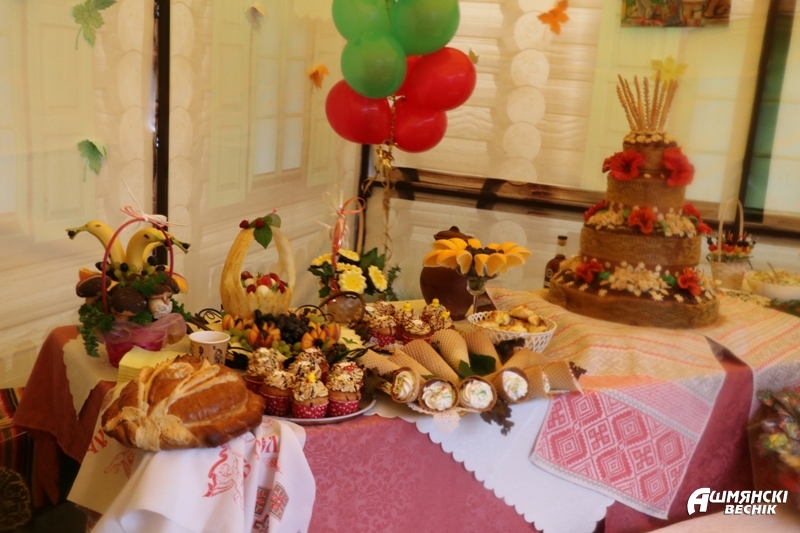 На «Дожиночной площадке» у здания почты разместились тематические подворья сельхозорганизаций. Выставки сельхозпродукции, разнообразно и со вкусом оформленные, привлекали своей пестротой. Каждое подворье встречало богато накрытым столом – символом гостеприимства и хлебосольности. Чего только не было на этих столах. Фаршированная скумбрия, чернослив, фаршированный грецкими орехами, котлеты, мясные рулеты, чебуреки, капкейки с карамельным кремом, четырехъярусный каравай весом 10 кг – все это многообразие, со вкусом оформленное и с душой приготовленное поваром Людмилой Климович разместилось на богатом столе КСУП «Крейванцы».