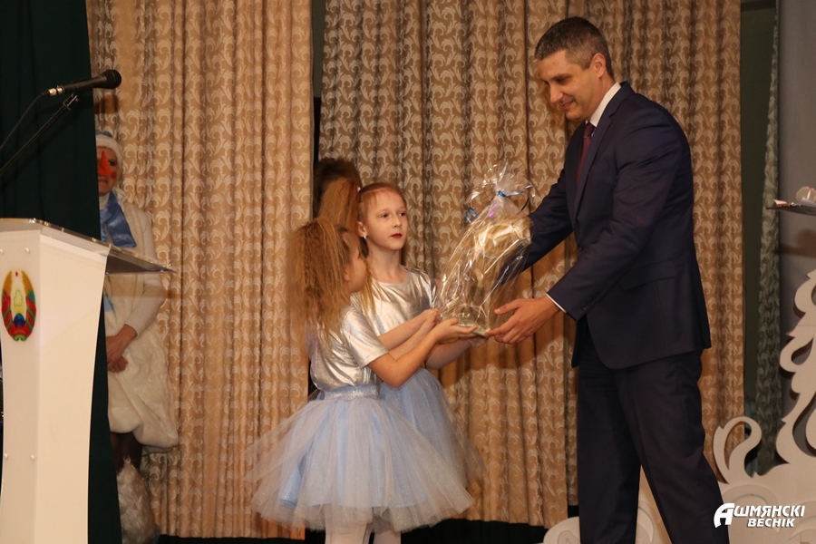 Поздравить детей пришли не только добрые волшебники и герои сказок и мультфильмов. Вместе с Дедом Морозом и Снегурочкой на празднике присутствовало руководство района во главе председателем райисполкома Владиславом Гершгориным. Владислав Владимирович поздравил присутствующих с наступающим Новым годом и высказал самые теплые слова пожеланий. В ответ председателю ребята из центра творчества детей и молодежи подарили изготовленный собственными руками сувенир.