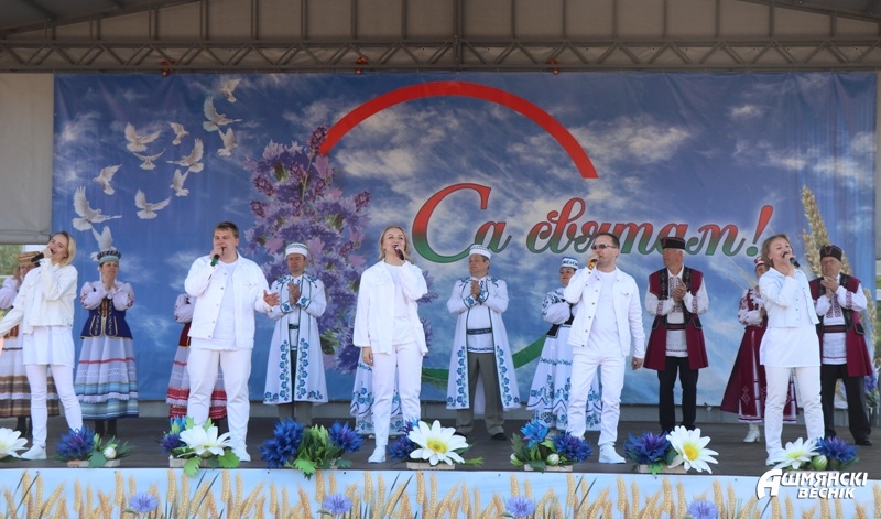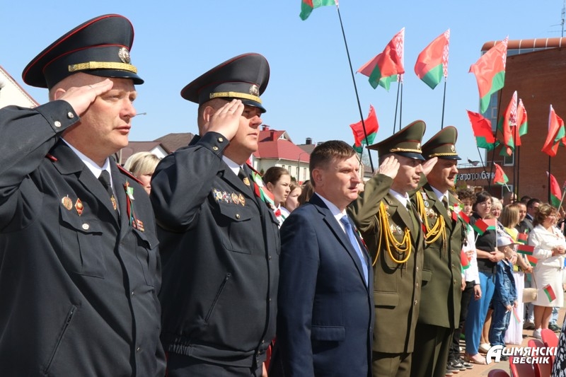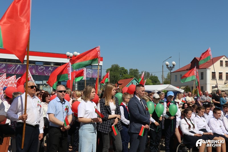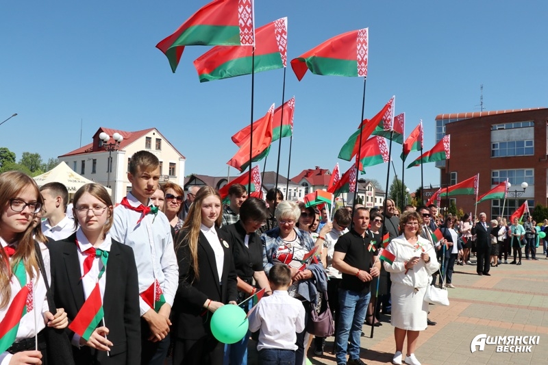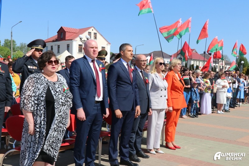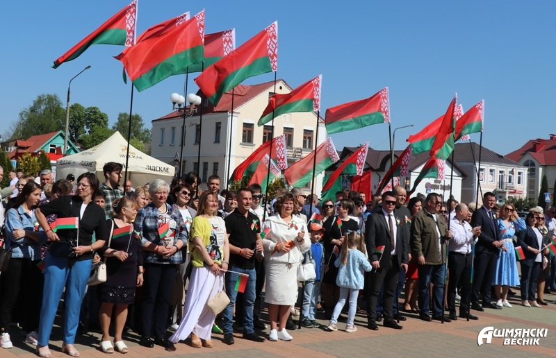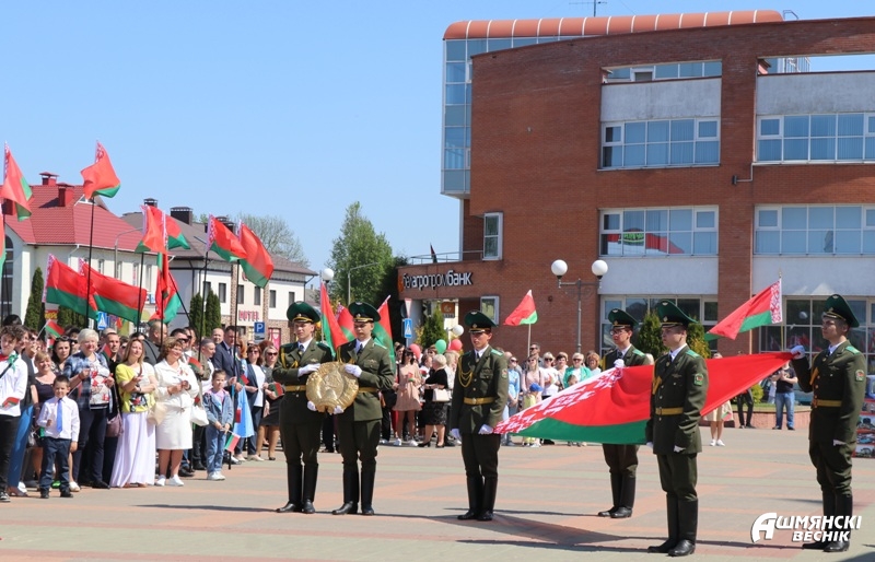В районном торжестве «Символы независимости, мира и созидания» приняли участие представители местной власти, трудовых коллективов и общественных объединений, учащиеся учреждений образования и работающая молодежь. Площадь у здания Ошмянского райисполкома раскрасили яркие знамена, с которыми пришли трудовые коллективы.