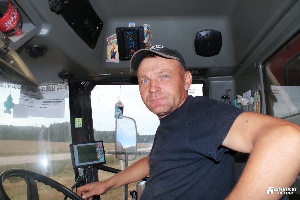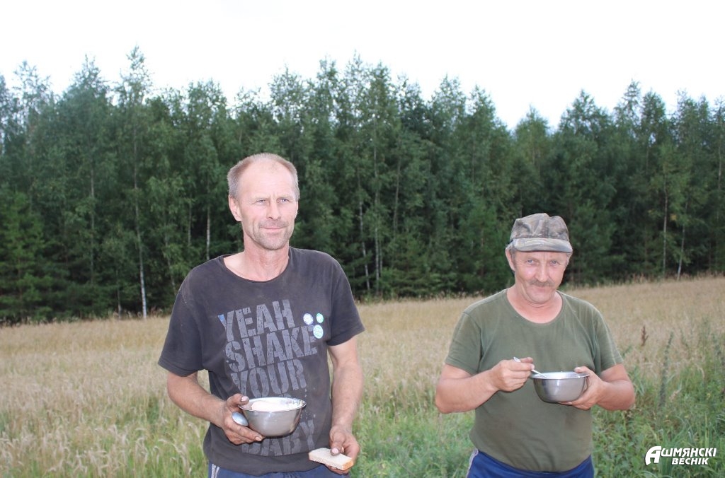 Зранку, як толькі спадае раса, і да “шэрых мух”, як кажуць вяскоўцы, кіпіць работа на полі. Здаецца, тут не ведаюць стомы. Рупліва працуюць на хлебнай ніве камбайнерскія экіпажы. Пра пікнікі або адпачынак на возеры думаць тут няма калі. У галаве – чарговыя тоны зерня, якое просіцца на зернеток, а яшчэ: “Хоць бы не падвяло надвор’е і не псавалася тэхніка!”.
