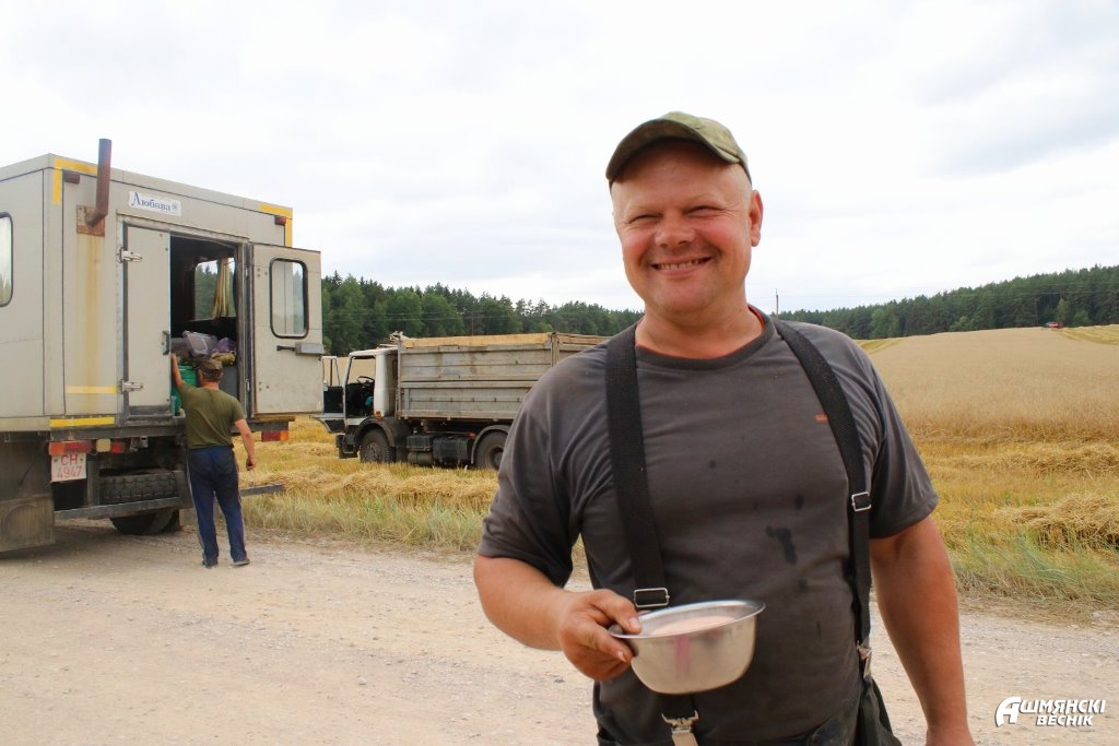 Перапынак спорнай працы робіць хіба што абед. Акурат на поле пад’язджае аўтамабіль Ашмянскіх электрычных сетак, якія аказваюць дапамогу гаспадарцы падчас жніва. Механізатары ўжо ведаць, што прывезлі абеды.