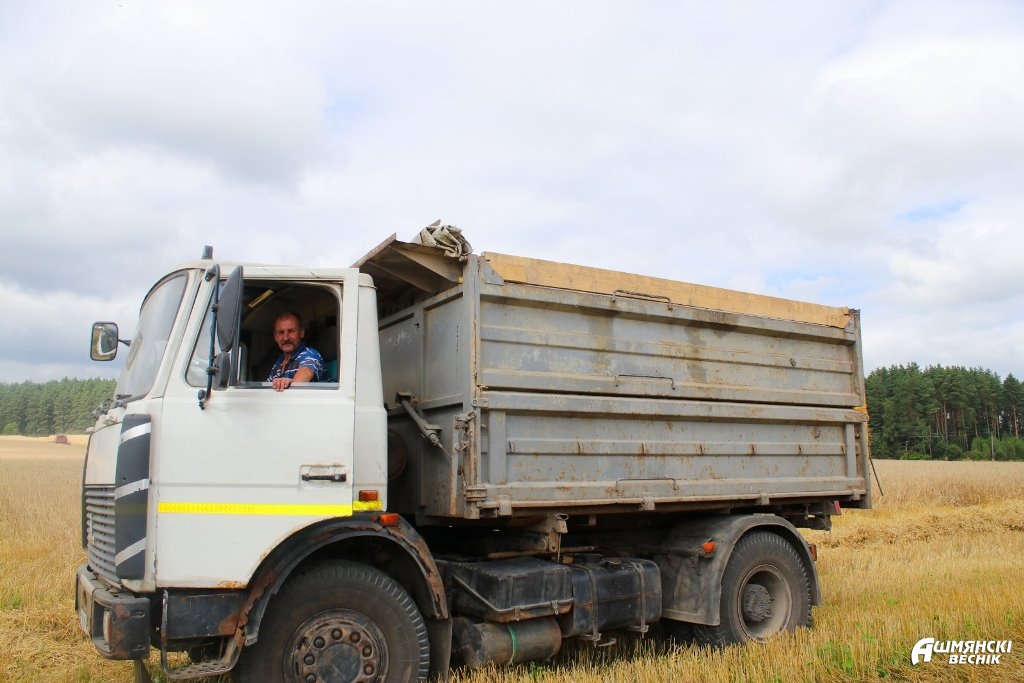 Адзін, другі круг – і напоўнены бункер трэба высыпаць. Поруч з камбайнерскімі экіпажамі – тры “МАЗы”. На адвозцы зерня задзейнічаны Валерый Суравец, які па стане на 19 жніўня перавёз 1030 тон збожжа, а таксама Мікалай Пяткевіч і Казімір Сальмановіч. Дзесяцітоннікі выдатна спраўляюцца са сваёй задачай: два бункеры – і аўтамабіль імчыць да зернесушылкі.