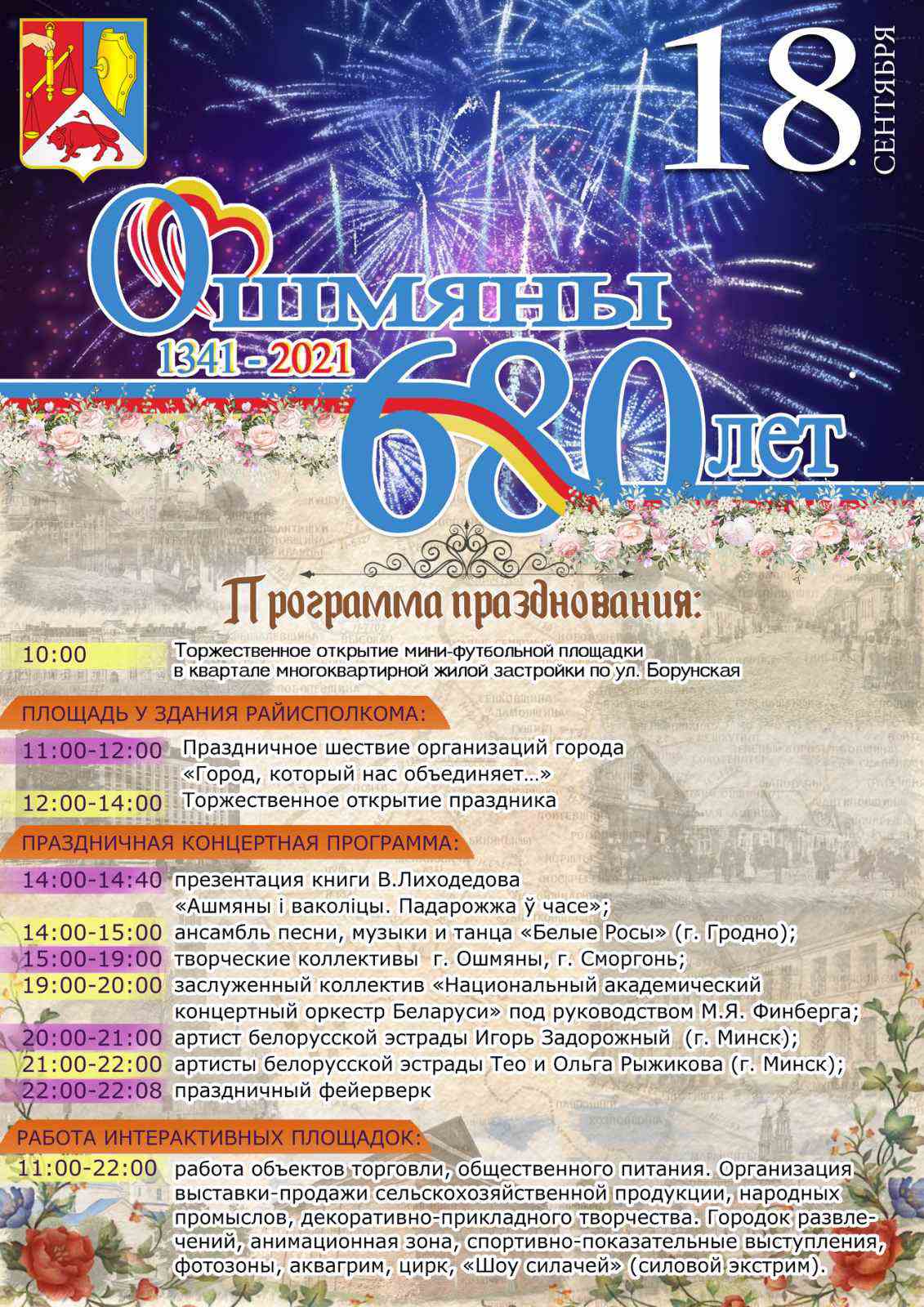 25 сентября 12.30 – 13.00 Праздничное шествие «Шлях да хлеба» (ул. Ленина) 13.00 – 15.30 Торжественное открытие фестиваля-ярмарки тружеников села «Дажынкі-2021» и церемония награждения (ул. Ленина) Работа праздничных площадок Центральный парк 11.00–17.00 Аллея – выставка конкурсных снопов и караваев «Дажыначны цуд» 11.00–17.00 Тематическая площадка «Адгалоскі маёй вёскі» 11.30–15.00 Рыбацкая площадка «КлЁвая» 11.30–17.00 Тематическая площадка «Хатка бабкі Агапкі» 12.00–13.00 Фотоаллея «Живые статуи» […]