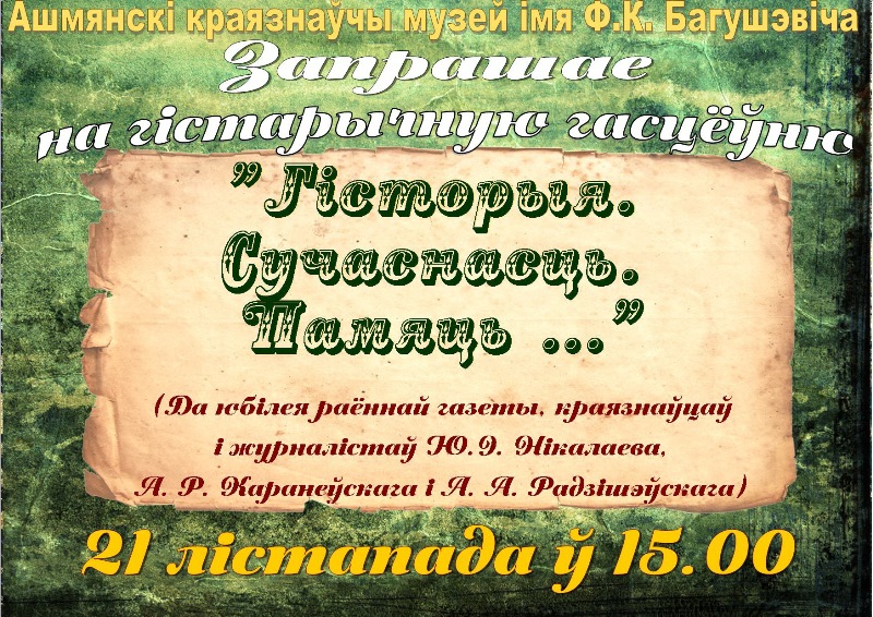 Международная краеведческая гостиная «Сустрэчы ў лістападзе — 2019» ко Дню рождения академика Е.Снядецкого состоится 30 ноября в Кольчунской школе (Гродненская область, Ошмянский район, аг.Кольчуны, ул.Дебесская 19 а). Начало: 10.00. Тема гостиной в 2019 году — «Постаці слаўныя краю майго». На мероприятие приглашаются учёные, преподаватели, педагоги, представители общественных организаций, историки, руководители школьных и государственных музеев, краеведы […]
