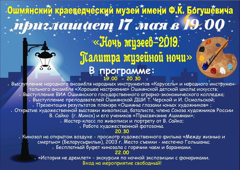 Ошмянский краеведческий музей имени Ф.К. Богушевича приглашает 17 мая в 19.00 на мероприятие «Ночь музеев-2019. Палитра музейной ночи» В программе: 19.00 — 20.30 Выступление народного ансамбля народных инструментов «Карусель» и народного инструментального ансамбля «Хорошее настроение» Ошмянской детской школы искусств; Выступление ВИА Ошмянского государственного аграрно-экономического колледжа под руководством А. Абрамовича; Выступление преподавателей Ошмянской ДШИ Т. Черской и […]