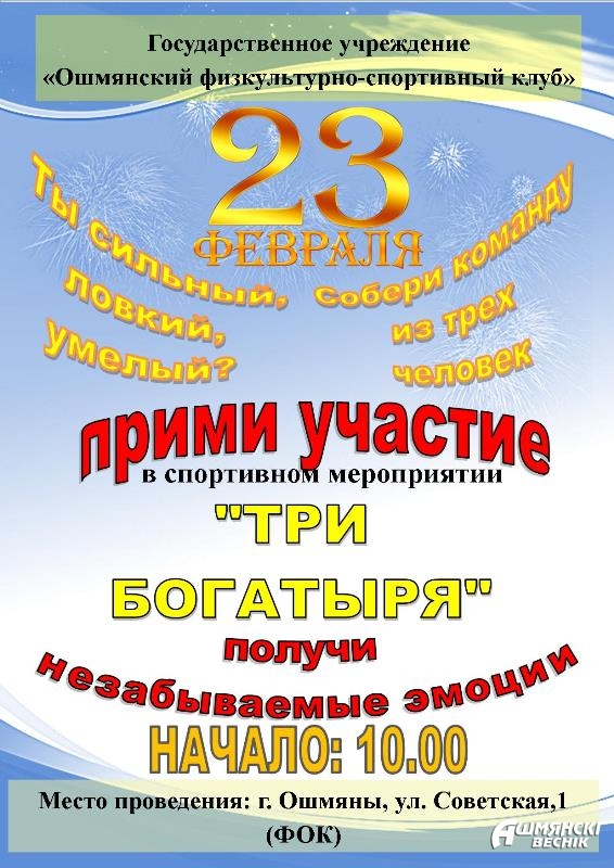 19 января «Ошмянская лыжня» приглашает на старт! В соревнованиях по лыжным гонкам примут участие учащиеся учреждений образования, работники предприятий и организаций, руководители, а также все желающие! Зимние забавы для зрителей с участием ростовых фигур. Аттракционы. Катание на катке. Начало праздника в 10:00 около здания ФОКа. (г.Ошмяны, ул.Советская, 1) 19 января на площадке кв. Строителей пройдут хоккейные […]