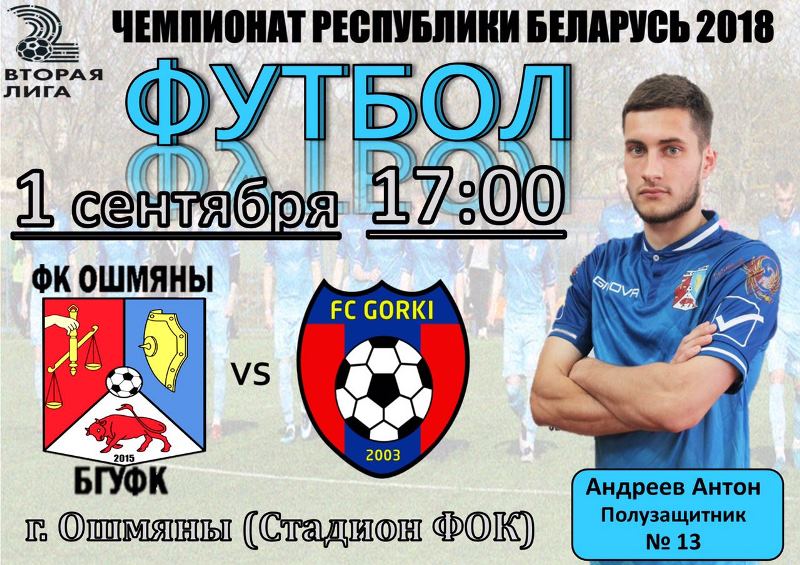 В субботу, 1 сентября, на стадионе физкультурно–оздоровительного комплекса по ул. Советской 1, состоится матч чемпионата Республики Беларусь по футболу среди команд 2-й лиги, между командами ФК «Ошмяны-БГУФК» и ФК «Горки», начало в 17.00. Приходите на стадион поддержать команду!