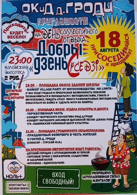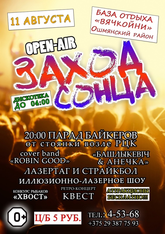 11 августа в агроусадьбе «Вячкойни» пройдет опен-эйр «Заход сонца» 20:00 Парад байкеров и клуба любителей БМВ (от стоянки около РЦК г.Ошмяны до агроусадьбы «Вячкойни») 20:20 Встреча парада, театрализованное открытие 20:30 Квест «Навстречу солнцу» 21:30 Выступление дуэта «Башлыкевіч & Анечка» 22:15 Ретро-концерт народного театра танца и песни «Импульс» 23:00 Выступление народного ансамбля цыганской песни «Джана Рома» 23:20 […]
