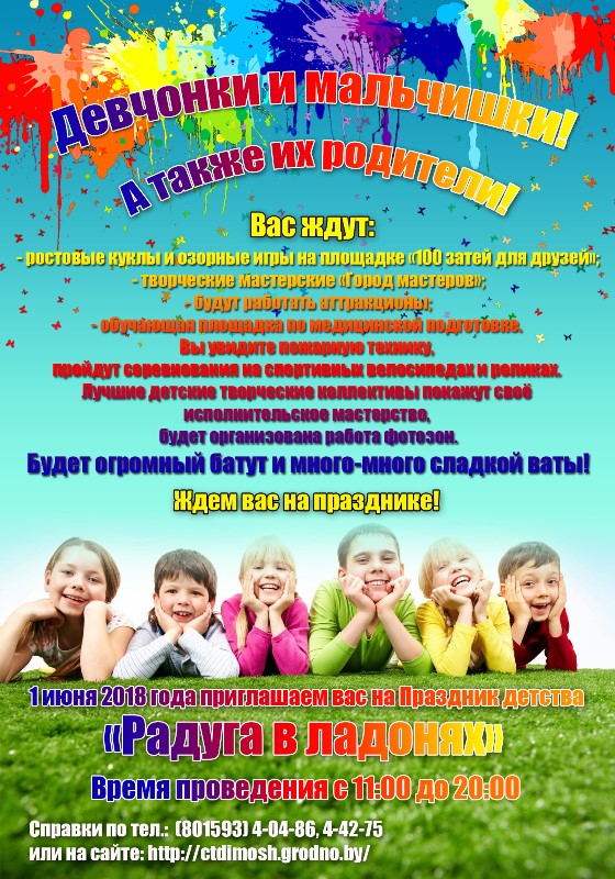 План проведения праздника ко Дню защиты детей «Радуга в ладонях» Время проведения Название мероприятия 11.00 – 12.30 Открытие праздника «Радуга в ладонях». Концерт детских творческих коллективов 11.00 – 13.00 Работа творческих мастерских «Город мастеров» 11.00 – 13.00 Работа игровой площадки «Сто затей для друзей» и аттракционов 12.30 – 13.00 Демонстрация пожарной техники 12.30 – […]