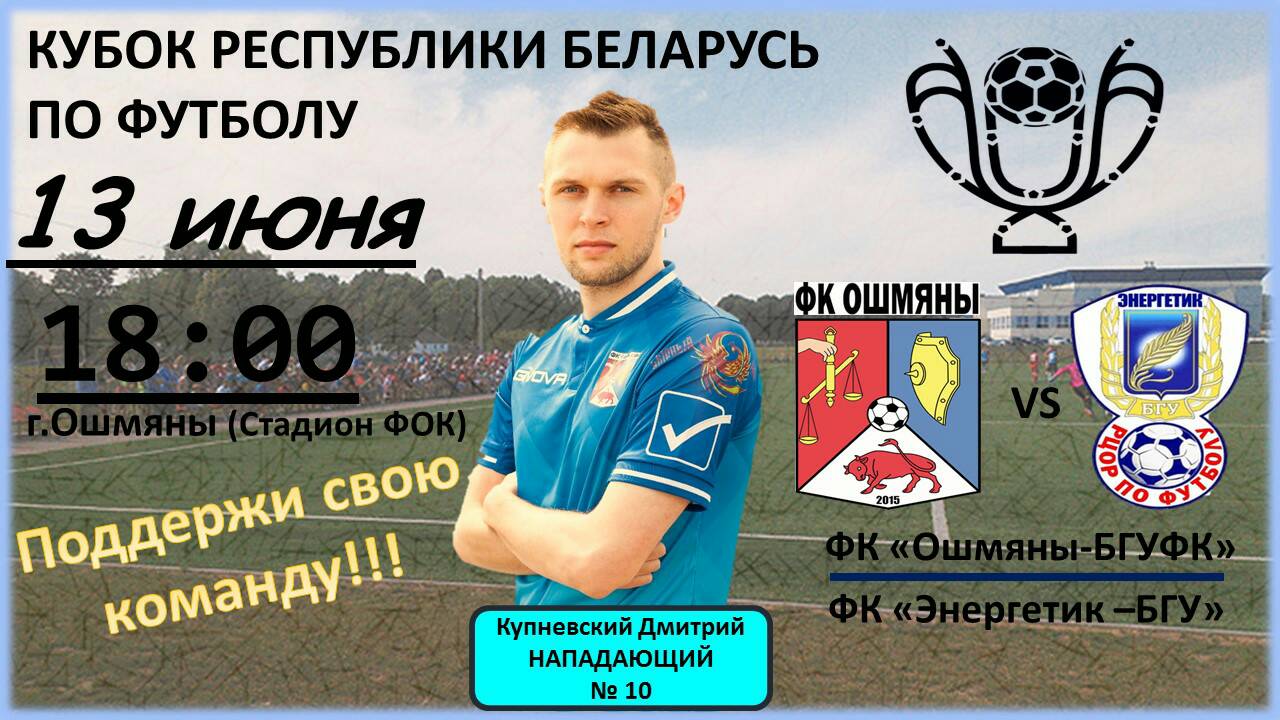В воскресенье, 27 мая, на стадионе физкультурно–оздоровительного комплекса по ул. Советской 1, состоится матч чемпионата Республики Беларусь по футболу среди команд 2-й лиги, между командами ФК «Ошмяны-БГУФК» и ФК «Энергетик-БГАТУ», начало в 17.00. Приходите на стадион поддержать команду!