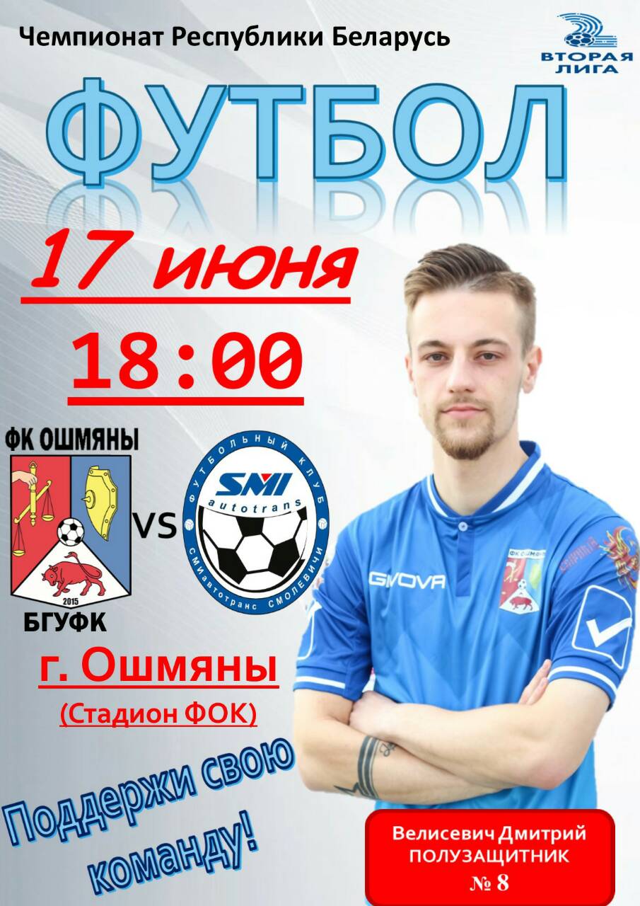 В воскресенье, 17 июня, на стадионе физкультурно–оздоровительного комплекса по ул. Советской 1, состоится матч чемпионата Республики Беларусь по футболу среди команд 2-й лиги, между командами ФК «Ошмяны-БГУФК» и ФК «СМИавтотранс», начало в 18.00. Приходите на стадион поддержать команду!