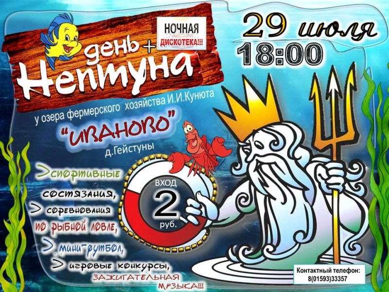 Вновь творческий коллектив сельского клуба агрогородка Боруны и предприниматель Иван Кунюта приглашают всех, всех, всех к озеру фермерского хозяйства «Иваново» 29 июля в 18.00 на культурно-спортивный праздник «День Нептуна». В программе: спортивные состязания, соревнования по рыбной ловле, мини-футбол, игровые конкурсы, зажигательная музыка и песни, и, конечно же, встреча с Нептуном и Русалками, которые окунут гостей […]