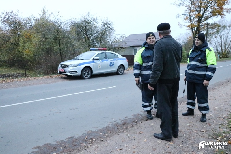 Издалека наблюдаем, как по этой улице молодой человек с ребенком выгуливают собаку. И курточка девочки, и одежда отца обозначены в нескольких местах светоотражателями, что позволяет отчетливо увидеть их на расстоянии. Сотрудники ГАИ благодарят ошмянцев за соблюдение правил.