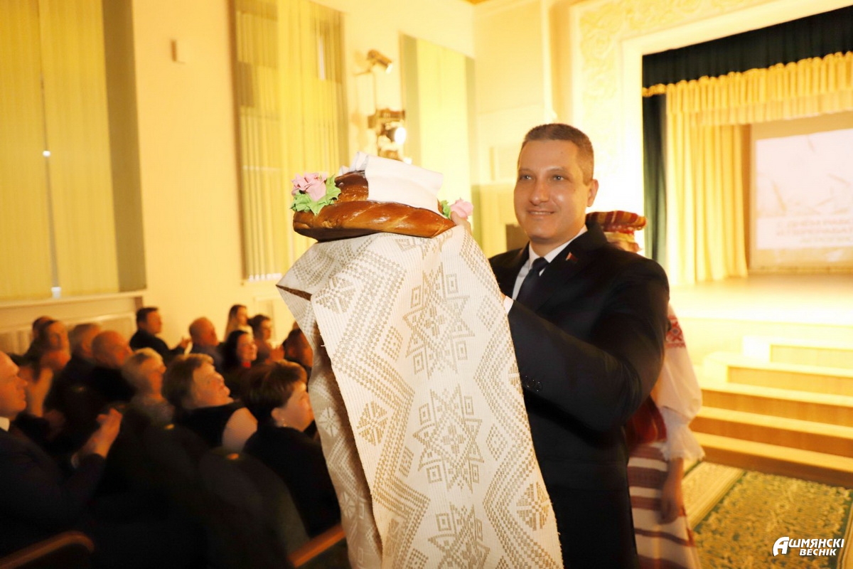 Главная часть торжества развернулась на сцене районного центра культуры. Под громкие аплодисменты председателю Ошмянского райисполкома Владиславу Гершгорину вручили каравай урожая 2023 года.