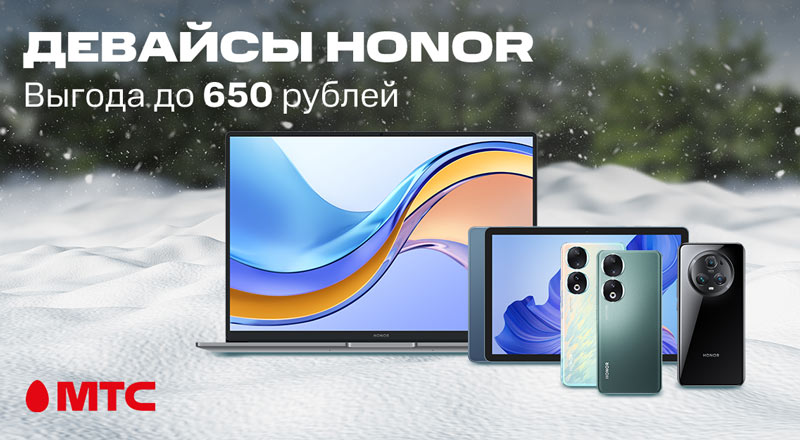 В интернет-магазине и салонах связи МТС можно приобрести смартфоны, планшеты и ноутбуки НONOR со скидкой до 650 рублей. При заказе гаджетов по 31 декабря 2023 года доставка осуществляется бесплатно — в любой регион страны!