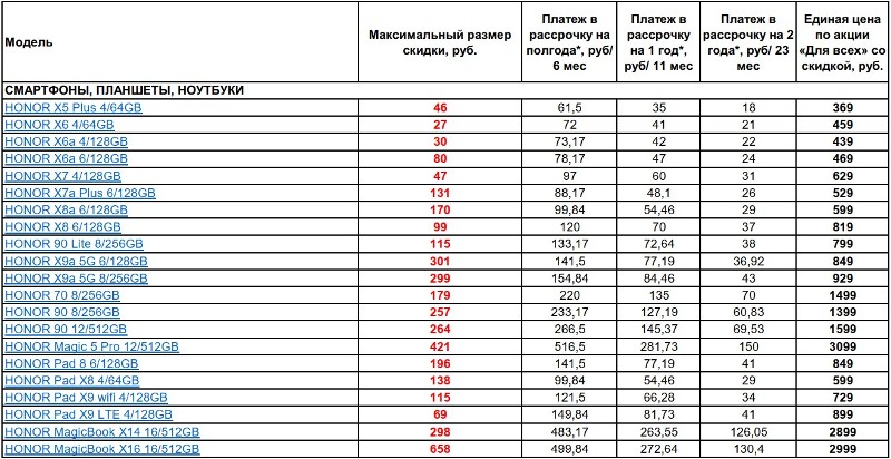 Перечень устройств HONOR с акционными ценами и максимальными размерами скидки представлен в таблице: