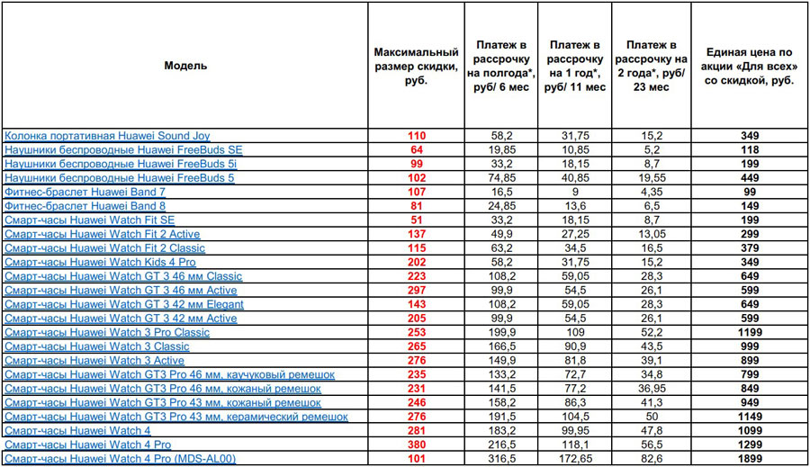 Перечень моделей смарт-часов, фитнес-браслетов, беспроводных наушников и колонок по выгодным ценам представлен в таблице: