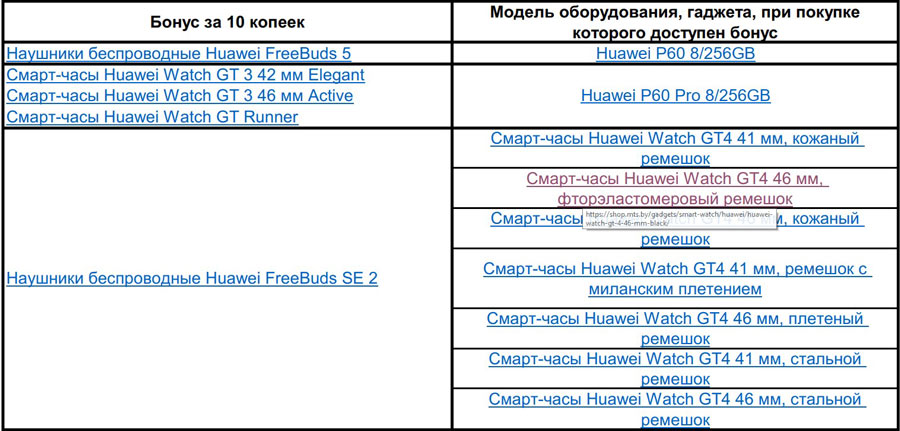 Также при покупке смарт-часов и смартфонов можно дополнительно забрать бонус за 10 копеек в рамках акции «Бонус+». Со списком моделей устройств и бонусов за 10 копеек можно ознакомиться в таблице: