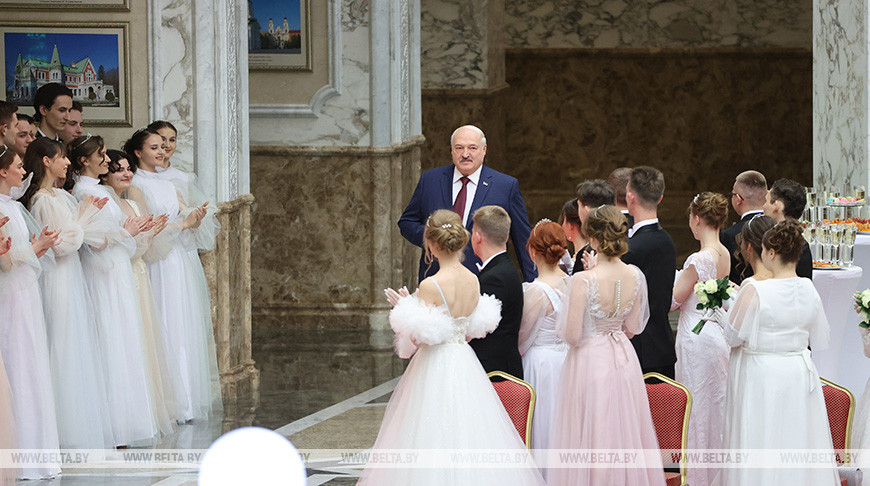 Всех собравшихся тепло приветствовал Президент Беларуси Александр Лукашенко. «Наступил тот единственный день в году, когда наш Дворец Независимости кардинально меняет свой облик. Буквально несколько часов назад в кабинетах, залах этого здания решались важные вопросы политики, экономики, безопасности. Сейчас здесь царит атмосфера музыки и танца. Атмосфера молодости. Важно то, что все это происходит один раз в год и только для вас, — отметил глава государства. — И видя удивительно красивых, счастливых молодых людей, я с благодарностью думаю о ваших родителях, учителях, преподавателях».