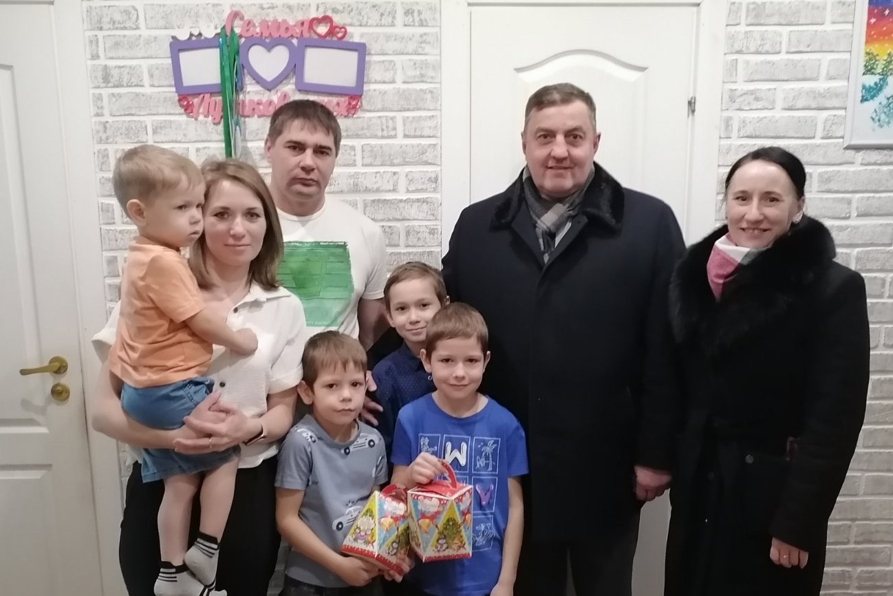 В семье Татьяны и Виктора, где воспитываются четверо мальчишек, уже ждали гостей. Александр Иванович поздравил всех членов дружного семейства с Новым годом и вручил детям наборы новогодних сладостей, а родителям – фруктовые наборы.