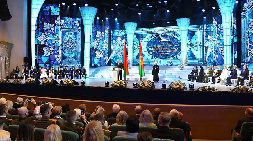 «В каждом наградном листе сегодняшних лауреатов — история всей нашей жизни, история страны, — подчеркнул белорусский лидер. — Все вы формируете образ будущего Беларуси, особенно находящиеся в этом зале. Мы формируем будущее Беларуси, сохраняя наше культурное достояние, возрождая старинные традиции народного мастерства и творчества в фестивалях и праздниках, давая новую жизнь шедеврам высокого искусства, встречая первыми появившихся на свет малышей, воспитывая подрастающее поколение на исконных духовных ценностях, проявляя милосердие и принимая участие в судьбе соотечественников, нуждающихся в особой опеке, поднимаясь во славу Родины на спортивный Олимп, помогая покорить эту вершину своим воспитанникам, освещая победы наших атлетов в средствах массовой информации».