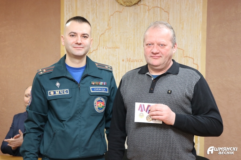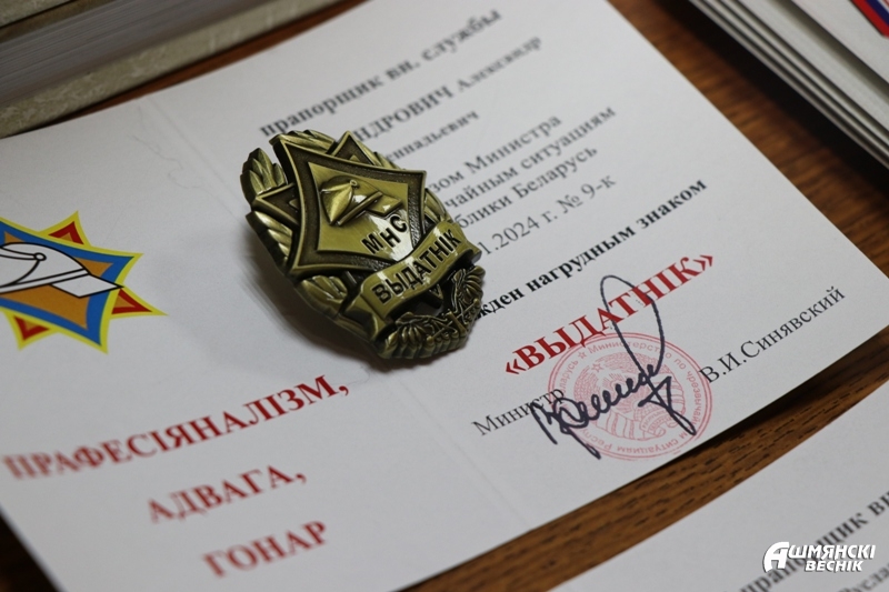 За значительный вклад в предупреждение и ликвидацию пожаров и чрезвычайных ситуаций и образцовое выполнение служебных обязанностей нагрудный знак Министерства по чрезвычайным ситуациям «Выдатнiк» вручен старшему инструктору-спасателю ПАСЧ-1 Руслану Антановичу и спасателю-пожарному ПАСЧ-1 Александру Александровичу.