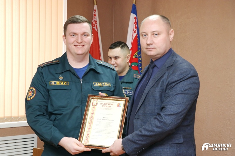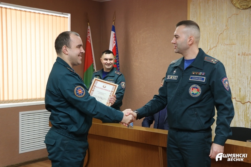 За достижение высоких результатов в оперативно-служебной деятельности и в связи с профессиональным праздником Почетной грамотой Ошмянского райисполкома награждены первый заместитель начальника РОЧС Алексей Башкирев и старшина группы материально-технического обеспечения и обслуживания Иван Жуковский. Благодарственным письмом председателя Ошмянского райисполкома отмечен труд инспектора сектора надзора и профилактики Дмитрия Макея и мастера-спасателя ПАСЧ-1 Андрея Шулиневича.