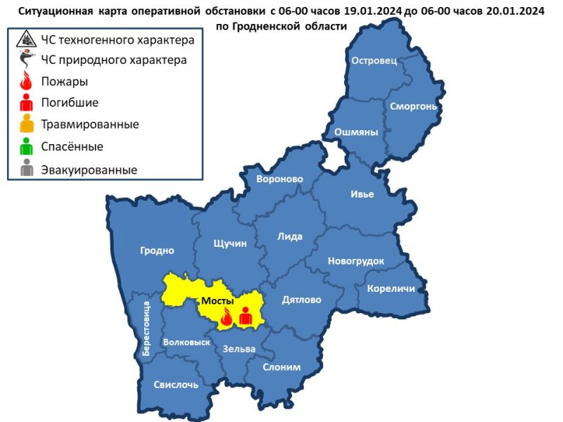 20.01.2024 в 00-17 поступило сообщение о пожаре жилого дома в г. Мосты по пер. Рабочему. В результате пожара уничтожены кровля, перекрытие, имущество в доме, повреждены стены. Погиб хозяин 1976 г.р. Причина пожара устанавливается.