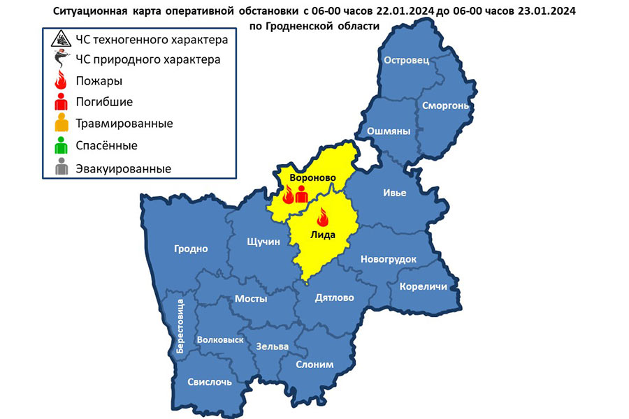 23.01.2024 в 03-08 поступило сообщение о пожаре жилого дома в д. Гудели Вороновского района. В результате уничтожены имущество, перекрытие и кровля, повреждены стены. Погибла хозяйка 1956 г.р. Причина пожара устанавливается.