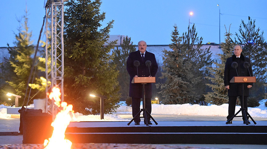 Президенты Беларуси и России возложили цветы к Вечному огню, осмотрели мемориальный комплекс.