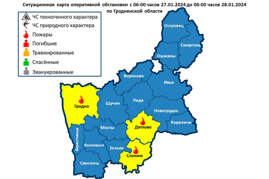 28.01.2024 в 01-59 поступило сообщение о пожаре в вагон-бытовке в г. Гродно. В результате повреждено имущество, закопчены стены и потолок. Причина пожара устанавливается.