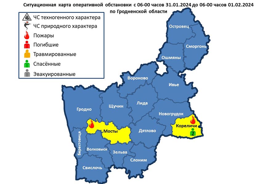 31.01.2024 в 18-59 поступило сообщение о пожаре жилого дома в г. Мосты по пер. Вокзальному. В результате повреждено имущество и перекрытие. Причина пожара устанавливается.