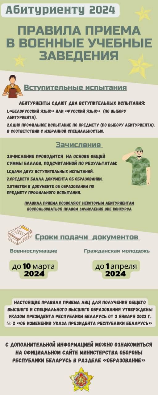Более подробную информацию о порядке поступления, перечне факультетов и специальностей, льготах, связанных с обучением в военно-учебном заведении, вы можете получить в военном комиссариате Ошмянского района по адресу: г. Ошмяны, пер. Больничный, 12, кабинет № 7 (группа призыва на военную службу) или по телефону 8-01593-77-837, либо на сайте Министерства обороны Республики Беларусь www.mil.by (раздел военное образование).
