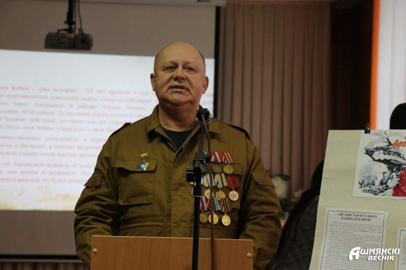 Ведущая, директор Ошмянского центра творчества детей и молодежи Ирина Буйницкая, сделав экскурс в историю афганской войны, передала слово заместителю председателя Молодежного парламента при Ошмянском районном Совете депутатов Ксении Шидловской и председателю детской районной палаты ОО «БРПО» Татьяне Селистровской. Девушки рассказали о воинах-интернационалистах Ошмянского района, погибших в Афганистане, – Сергее Золотареве, Эдуарде Кеда, Сергее Клинцевиче. Звучали воспоминания родных и близких о погибших ребятах и строки из писем Сергея Золотарева — больше о буднях, меньше о боевых действиях, в которых сквозили любовь к близким и надежда на возвращение, которой не суждено было сбыться. Память о советских солдатах, погибших в афганской войне, присутствующие почтили минутой молчания.