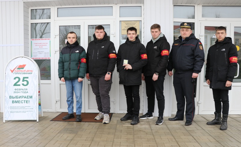 Молодежное формирование колледжа из числа активистов БРСМ всегда приходит на помощь правоохранителям. В этот раз ребята из добровольной дружины имени воина-интернационалиста Сергея Клинцевича патрулируют территорию возле Советского избирательного участка №20: именно здесь в основном и голосуют учащиеся этого учреждения образования, при этом практически все голосуют впервые.