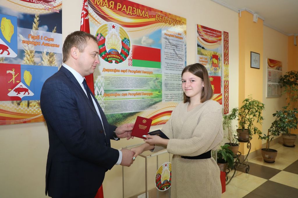 Лидия принимала поздравления от председателя участковой избирательной комиссии Авдеевского участка для голосования №15. Девушке вручили Конституцию Республики Беларусь. Неожиданным сюрпризом для студентки Молодечненского политехнического колледжа стали цветы, которые подарила ей мама.