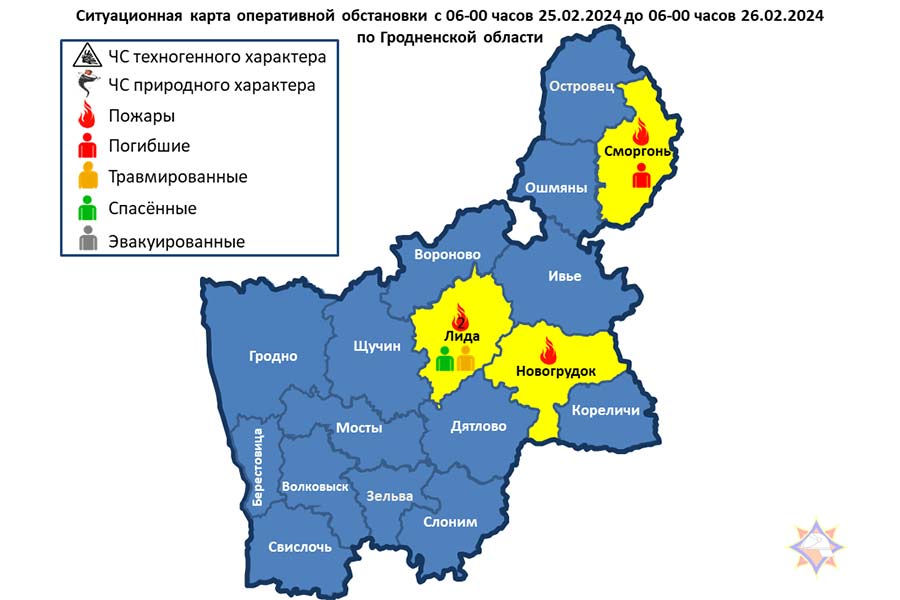 26.02.2024 в 00-12 поступило сообщение о пожаре жилого дома в д. Выголененты Сморгонского района. В результате уничтожена кровля, перекрытие, имущество в доме, повреждены стены. В 01-19 обнаружен погибший хозяин дома 1965 г.р. Причина пожара устанавливается.