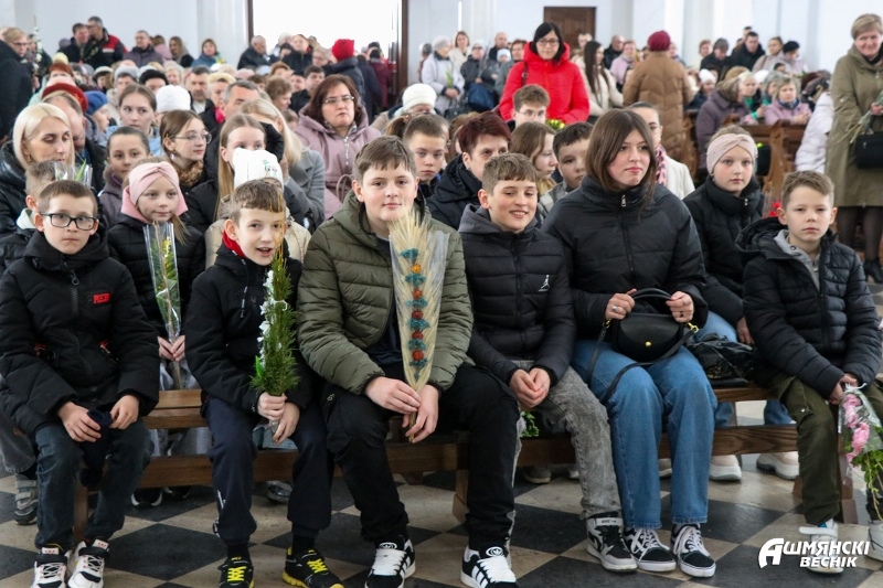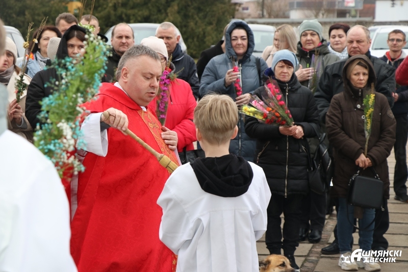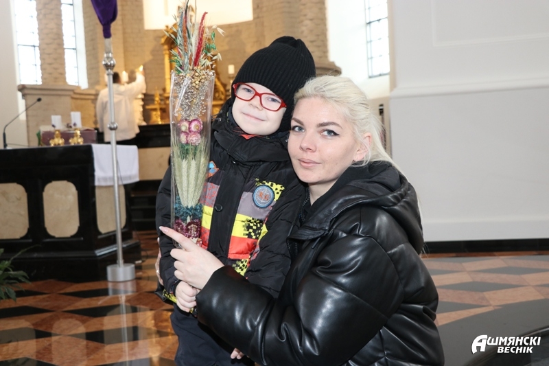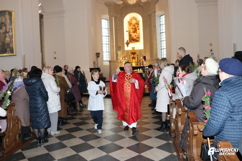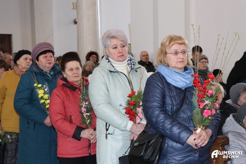 У касцёле святога Міхаіла Архангела ў гэты дзень шматлюдна на ўсіх імшах. Моладзь, дзеці і людзі старэйшага веку прыйшлі ў храм, каб пакланіцца Госпаду, асвяціць сімвалічныя галінкі і духоўна падрыхтавацца да галоўнага хрысціянскага свята – Вялікадня.