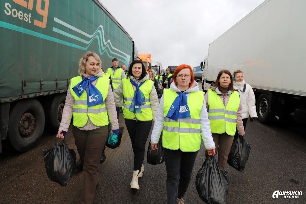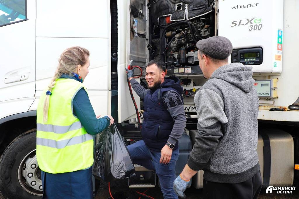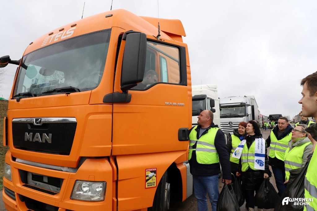 А сегодня неравнодушные белорусы решили протянуть руку помощи водителям большегрузов, которые неделями ожидают в очереди, чтобы пересечь границу. По данным Пограничного комитета Беларуси, на 5 апреля около 3000 фур ожидают въезда в ЕС, 850 из них – перед пунктом пропуска «Каменный Лог». Представители общественных организаций Ошмянского и Островецкого районов провели акцию «Дружба без границ», во время которой активисты Ошмянского райкома Белорусского профсоюза работников образования и науки, районной организации ОО «Белорусский союз женщин», островецких первичных организаций раздавали водителям продуктовые наборы, воду, средства гигиены.