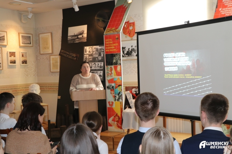 Было отмечено, что лагеря стали жерновами смерти, где от голода и болезней умирали невинные люди. Особое внимание сотрудники музея уделили концентрационным лагерям, которые действовали на территории Беларуси. Школьники вспомнили самые крупные из них, которые находились в Минске, Озаричах, Гомеле и других населенных пунктах. Короткий фильм познакомил ребят с некоторыми шталагами. Мемориальный комплекс «Шталаг-342» в Молодечно был создан в 1995 году, чтобы увековечить память жертв концлагеря. На территории лагеря было уничтожено более чем 33 150 военнопленных и мирных жителей, а в общей сложности через лагерь прошло 70-80 тысяч человек. Примером антигуманного отношения стал лагерь военнопленных, находившийся в нашем городе на улице Гольшанской. Режим лагеря был направлен на истребление заключенных, для них были созданы нечеловеческие условия: их заставляли выполнять непосильные работы, морили голодом, а за малейшую провинность заключенных расстреливали.