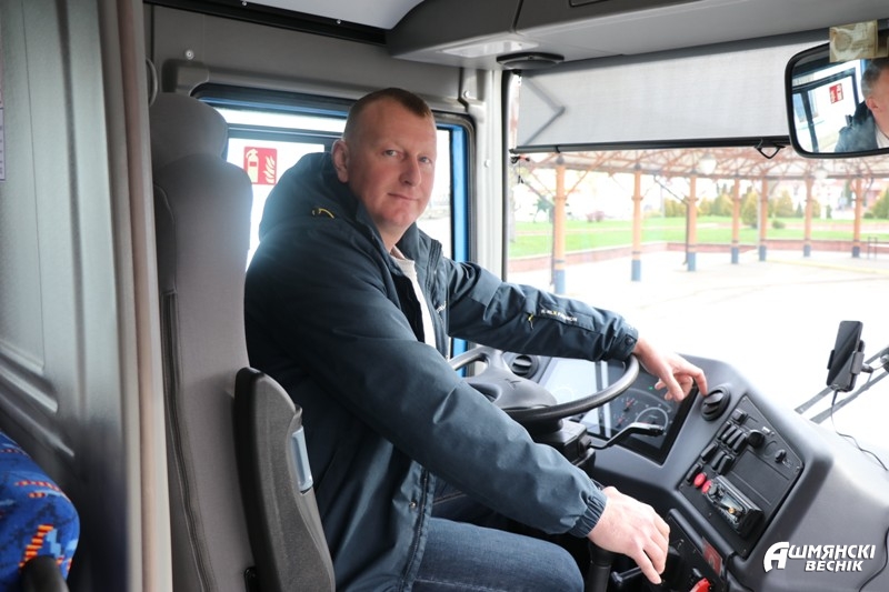 Один МАЗ 257040 небесно-синего цвета с прошлой недели уже регулярно выходит на линию, и пассажиры пригородных рейсов смогли оценить его качество. Новым автобусом управляет водитель Александр Прокопчик, который работает в автопарке с 2013 года. Главное качество Александра Евгеньевича – ответственность: он всегда в порядке содержит доверенную ему технику, внимательно относится к пассажирам. Он рассказал, что в новом автобусе все пассажирские сидения, а их 31, имеют ремни безопасности, установлены кондиционер, видеорегистратор и система видеонаблюдения. Водитель доволен новым автобусом – он сам забирал его с Минского автозавода, так что уже испробовал технику и на автотрассе, и на дорогах района, и на городских улицах.