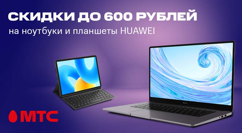 В МТС можно приобрести различные модели планшетов и ноутбуков HUAWEI по сниженным ценам. Их можно оформить в рассрочку до 24 месяцев без переплат, а также с экономией до 600 рублей.